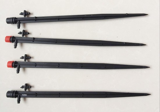 地插微噴組合中,常用的插桿長度為50公分左右,上部通過山字形轉換接頭將微噴頭、毛管及插桿相連接,毛管另一側通過毛管雙接頭與PE管連接。最后將插桿插入土壤固定好,地插微噴組合便完成了安裝。